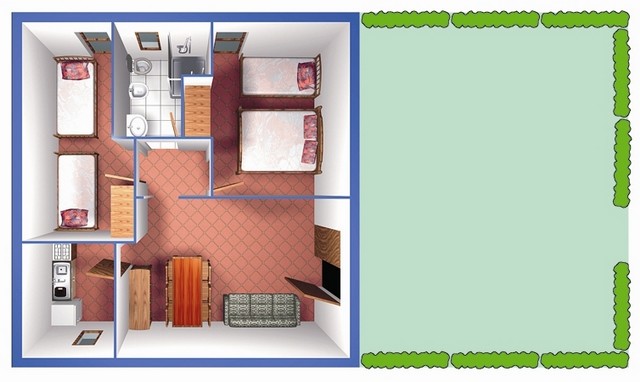 Wohnzimmer mit Schlaf-Couch, abgeteilte Küche, 1 Dreibettzimmer, 1 Zweibettzimmer, DU/WC.